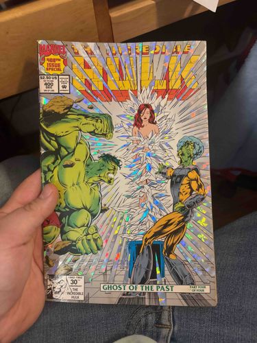 This is a vintage comic book titled 'The Incredible Hulk' issue #400, published by Marvel Comics in December 1992. As a milestone '400th Issue Special,' it features a distinctive holographic silver foil cover that reflects a spectrum of colors when hit by light. The cover art, illustrated by Jan Duursema, depicts the Hulk facing off against the Leader, with a crystalline structure holding a female figure (Betty Ross) in the center. The price tag on the cover is $2.50 USD. This issue is part of the 'Ghost of the Past' storyline (Part 4 of 4). It also includes a 30th-anniversary (1962-1992) corner stamp featuring the Hulk. Physically, the item shows signs of handling and wear typical of its age. Notable condition issues include visible color breaking spine stresses, slightly rounded corners, and some minor 'foxing' or darkening along the right edge of the front cover. The foil surface appears to have some light scuffing. The staples appear intact, though the alignment of the cover wrap is slightly off-center. This specimen is from the Modern Age of comic books and represents a period when 'gimmick' covers, like holofoil, were highly popular among collectors.