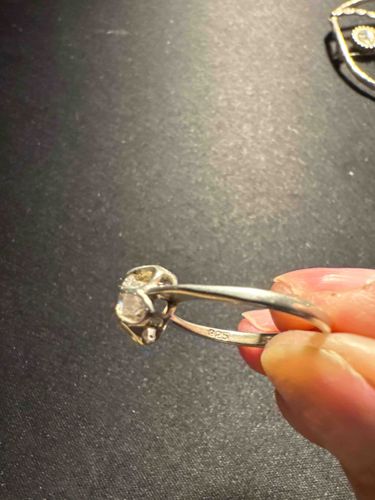 This is a contemporary-style solitaire ring featuring a large, brilliant-cut clear stone, likely a cubic zirconia, set within a multi-pronged basket mount. The ring is constructed from sterling silver, clearly indicated by the '925' hallmark stamped on the interior of the shank. The setting is a traditional six-prong design that elevates the stone to maximize light entry and sparkle. The shank is relatively thin and tapers slightly as it reaches the head of the ring. Regarding condition, the metal shows signs of moderate wear with visible surface scratches and some dark oxidation or tarnish, particularly around the prong hardware and the interior stamp. The stone appears somewhat dull, which may suggest a buildup of surface residue or minor abrasions common in synthetic stones. No missing prongs or structural fractures are immediately visible, but the metal displays a dark patina consistent with age and frequent handling. The craftsmanship is indicative of mass-produced fine jewelry from the late 20th to early 21st century, prioritizing classic aesthetics and affordability.