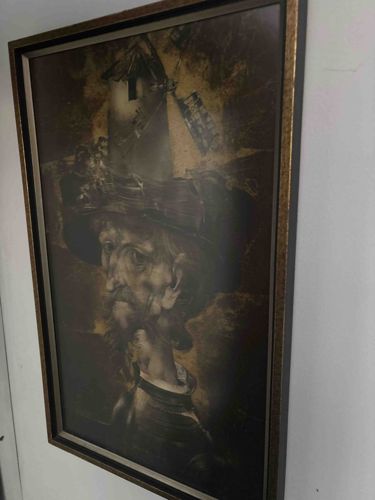 This item is a large-format reproduction print of the famous surrealist artwork 'Don Quixote' by the Spanish master Salvador Dalí. The artwork features a highly stylized, elongated portrait of the literary knight errant, rendered in a sepia-toned monochromatic palette that suggests age and antiquity. A windmill—a central symbol from Cervantes' novel—is cleverly integrated into the structure of Quixote's helmet, blurring the lines between reality and delusion. The character's face is weathered, with deep-set eyes expressing a sense of madness or visionary zeal. The print is housed in a contemporary, slim-profile bronze-toned wooden frame with a subtle metallic finish. The overall composition is approximately 24x36 inches, though specific dimensions would require physical measurement. The construction appears to be a lithographic or offset print on textured paper or canvas. Notable features include the intricate linework and the dramatic use of shadow. In terms of condition, there is slight bubbling or waviness in the paper substrate under the glass, suggesting minor humidity exposure, and the frame shows light scuffing along the edges. No visible artist signature or edition number is discernible from the current angle, which suggests it may be a decorative poster or an open-edition print rather than a limited-edition lithograph.
