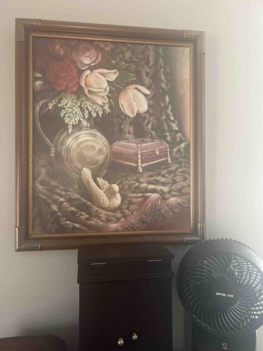 This item is a framed original oil painting on canvas, depicting a classic still life arrangement in a traditional or neo-classical style likely dating from the mid-to-late 20th century. The composition features a bouquet of red and cream roses in a silver-plated pitcher, adjacent to a decorative velvet-lined jewelry box and a small white bird figurine. The objects sit upon a heavily draped, fringed textile which dominates the lower third of the canvas. The color palette is somber and rich, utilizing deep burgundies, muted greens, and earthy browns, with highlights focused on the metallic sheen of the pitcher and the delicate petals of the cream lilies. The lighting is dramatic, suggesting a single light source from the left that creates soft chiaroscuro effects. The canvas appears to be in good condition with no visible tears or significant paint loss, though minor surface dust and yellowing of the varnish may be present. It is housed in a substantial gold-toned wooden frame that features metallic corner brackets and a reed-like texture, adding a decorative vintage flair. This piece demonstrates skilled brushwork and a balanced composition typical of commercially successful decorative art from the 1970s or 80s.