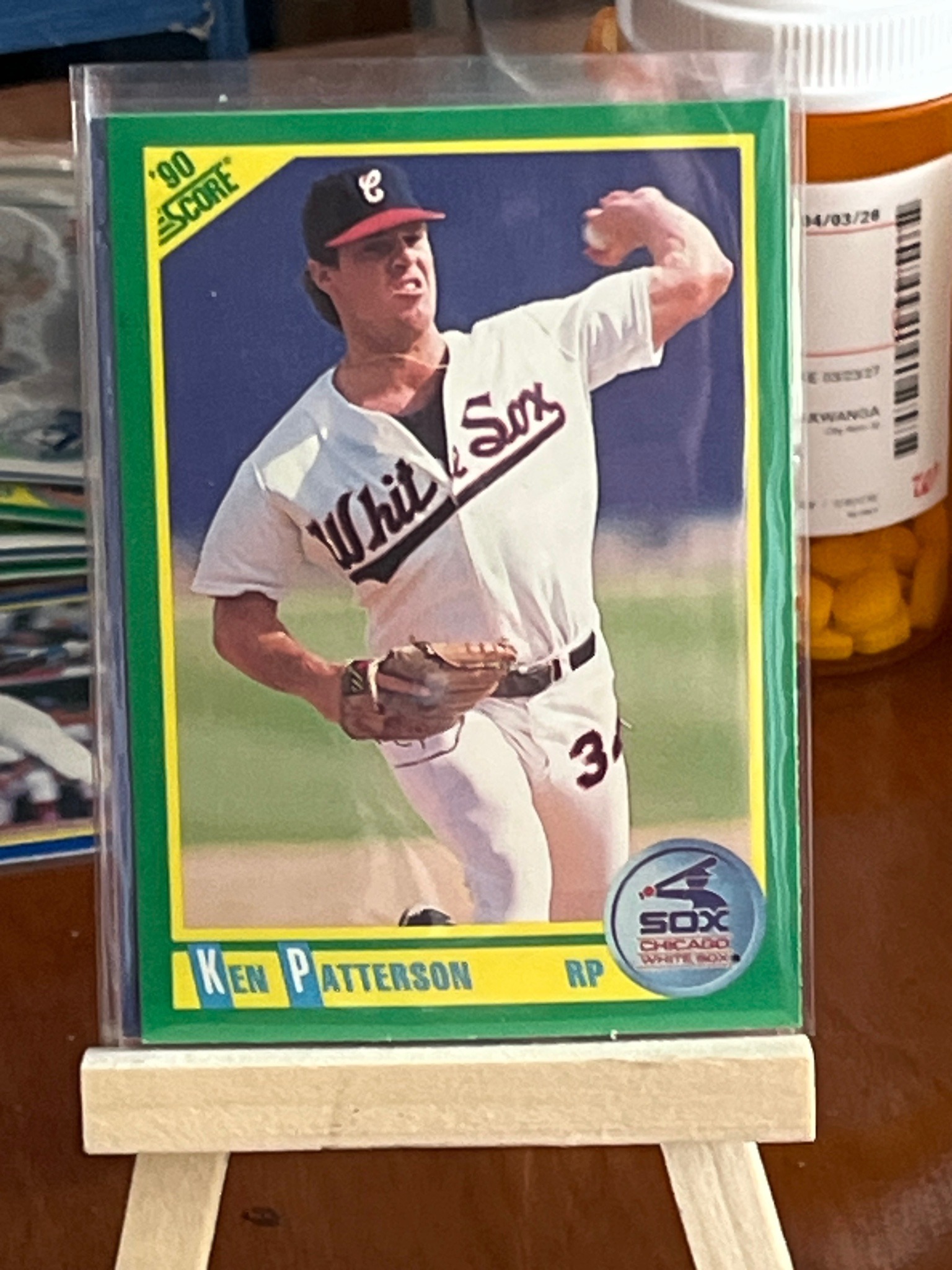 This is a standard 2.5 by 3.5-inch trading card featuring relief pitcher Ken Patterson of the Chicago White Sox. The card belongs to the 1990 Score baseball card set. The design features a bold green primary border with a yellow inner frame surrounding an action shot of Patterson in mid-delivery wearing the home white jersey. Notable graphic elements include the '90 Score' logo in the upper left corner and a circular Chicago White Sox team logo in the bottom right corner. The player's name and position (RP) are displayed at the bottom in a stylized alternating blue and yellow block format. In terms of condition, the card appears to be housed in a protective soft sleeve, which has helped maintain the sharpness of the corners and edges. The centering seems relatively balanced for the era, though there is a slight top-to-bottom bias. No significant surface scratches, creases, or discoloration are visible on the front. This mass-produced card from the 'junk wax' era remains a clean example of 1990s sports memorabilia aesthetic, showing well-preserved color saturation and glossy finish.