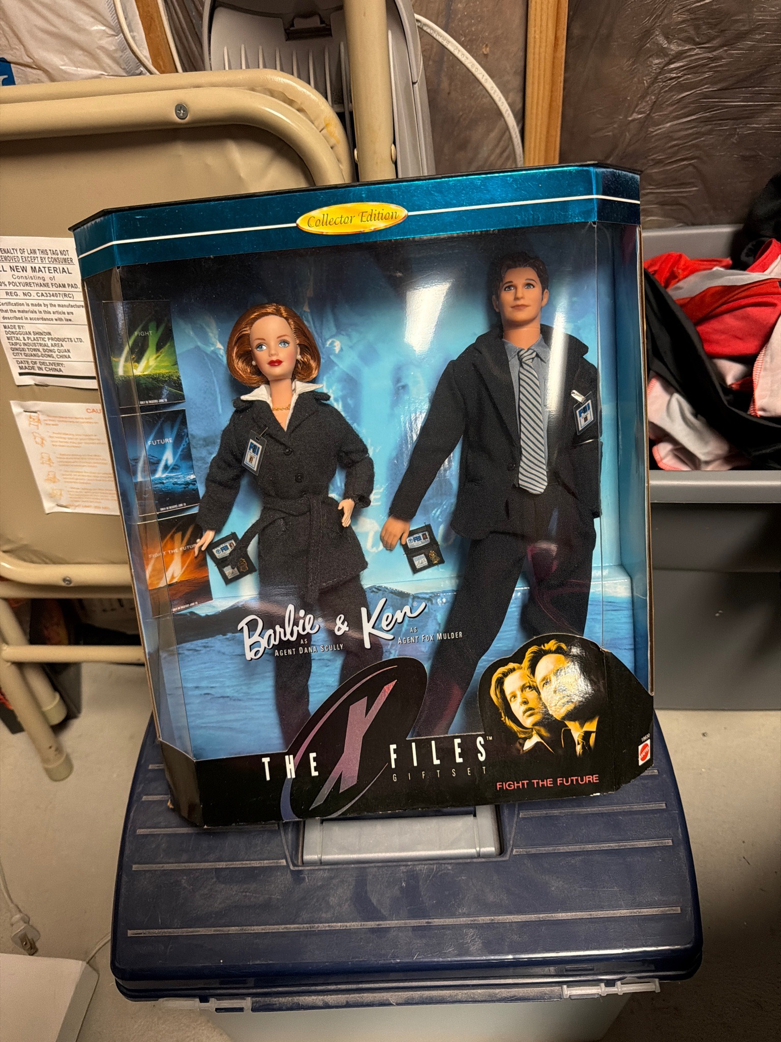 This is a 1998 Collector Edition Barbie and Ken gift set released by Mattel to commemorate 'The X-Files' feature film, 'Fight the Future.' The set features two 11.5-inch vinyl dolls dressed in iconic FBI attire. Barbie is featured as Agent Dana Scully, sporting her signature red bob-cut hair, a navy blue trench coat, a white blouse, and a gold-tone necklace. Ken is featured as Agent Fox Mulder, wearing a dark navy suit, a light blue button-down shirt, and a striped tie. Both dolls are accessorized with mini replicas of their FBI badges clipped to their jackets and handheld credentials. The packaging is a specialized display box with a blue and black theme, featuring the 'X' logo and promotional images from the movie. The dolls appear to be in 'Never Removed From Box' (NRFB) condition, though the external cardboard box shows minor signs of shelf wear, specifically softening at the corners and light scuffing on the plastic display window. The interior backdrop features a snowy landscape reminiscent of the film's climax. This set is a cross-collectible item, appealing to both Barbie enthusiasts and fans of the sci-fi television series.