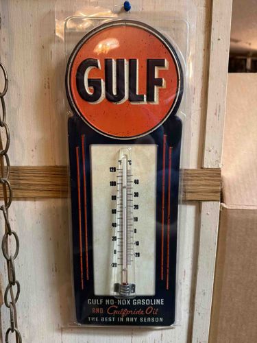 This is a vintage promotional wall thermometer for Gulf Oil, likely dating from the mid-20th century (circa 1940s-1960s). The item features a vertical rectangular layout with a prominent circular header. The header displays the iconic 'GULF' logo in bold, dark blue/black block lettering with a drop-shadow effect, set against a classic orange circular background outlined in blue. Below the logo is a dark blue body with orange Art Deco-style vertical speed lines on the left and right sides. The center houses a vertical glass thermometer tube displaying both Celsius and Fahrenheit scales on a white background. The bottom of the signage reads 'GULF NO-NOX GASOLINE AND Gulfpride Oil' followed by the slogan 'THE BEST IN ANY SEASON'. The piece appears to be made of either painted tin or enameled steel. Notably, the item is still stored within what appears to be a modern protective plastic sleeve, which has preserved its condition. The colors remain vibrant with minimal visible chipping or fading, though some slight surface variations suggest authentic age. The font styles used are consistent with mid-century automotive advertising, blending bold sans-serif fonts with elegant cursive for the 'Gulfpride' branding. This type of petroliana is highly collectible and sought after for garage or man-cave decor.