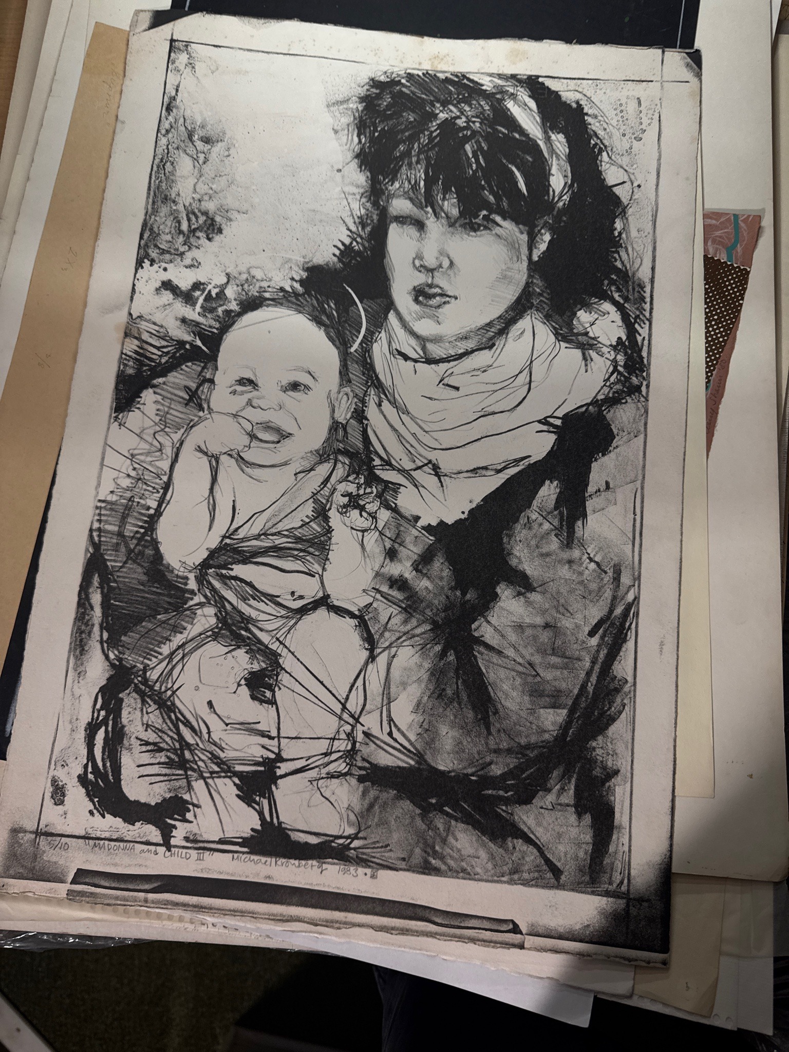 This is an original limited edition lithographic print titled 'Madonna and Child III' created by the artist Michael Kronberg in 1983. The artwork is rendered in black ink on a heavy cream-toned paper with deckled edges. It features a portrait of a woman with dark hair holding a small child; the style is expressive and gestural, utilizing heavy contrast, cross-hatching, and broad ink strokes to create depth and texture. The subjects are depicted with stylized halos represented by thin circular lines. The print is numbered 5/10 in the lower left corner, indicating a very small edition size. The title and artist's signature 'Michael Kronberg 1983' are inscribed in the lower margin. The composition shows the artist's use of transfer or stone lithography techniques, evidenced by the characteristic grain and the rectangular plate mark frame. Regarding condition, the paper shows significant signs of age and wear including visible foxing (brown spotting) across the top margin, minor creasing at the corners, and a slight yellowing of the paper stock. There is some edge wear and minor tearing consistent with handling unframed paper. The craftsmanship reflects a skilled hand during the early 1980s neo-expressionist era, balancing representational forms with aggressive, abstract mark-making.