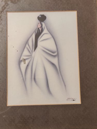 This artwork is a signed lithograph by the celebrated Kiowa artist Robert Redbird (1939-2016). It features a central figure of a Native American woman draped in a voluminous white blanket, a signature motif of the artist. The blanket is rendered with soft, fluid shading in grays and blues to suggest depth and movement. Atop her head, she balances a dark, traditional polychrome jar. Her profile is visible, showcasing a serene expression and dark hair with white highlights. The background is a minimalist off-white or cream color, emphasizing the silhouette. The piece is signed 'Robert Redbird' in the lower right corner, likely accompanied by his characteristic feather symbol. The artwork is mounted on a brown textured mat board. Noteworthy condition issues include visible foxing and small brown moisture spots (staining) on the left side of the paper, as well as a more prominent rectangular discoloration mark on the central fold of the blanket. These signs of aging suggest the piece dates to the late 20th century. The craftsmanship reflects the Contemporary Native American Art movement, characterized by a smooth, airbrushed aesthetic and soulful representation of Indigenous identity.