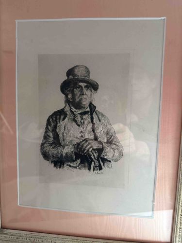 This item is a framed ink-wash or high-contrast pen and ink illustration on paper, depicting an elderly man in 19th-century attire. The subject features a prominent top hat or bowler style hat, a high-collared coat, and hands resting upon a cane. The artist’s signature, 'K. Lentira', is visible at the lower right of the primary image. The style is reminiscent of late 19th to early 20th-century character studies, characterized by fine cross-hatching and stippling techniques to create depth and texture. The paper shows signs of age-related toning (yellowing), particularly around the edges of the plate mark. It is housed in a decorative double-mat assembly; the inner mat is a peach or salmon silk-textured fabric, and the outer border appears to be a distressed or antiqued wood frame with a cream-colored finish. The composition uses a centralized figure against a neutral background, highlighting the stern, expressive facial features of the subject. The overall condition appears fair to good, with some light reflection on the glass indicating it has been preserved, though the matting shows slight discoloration. The craftsmanship reflects a high degree of technical skill in line work and characterization.