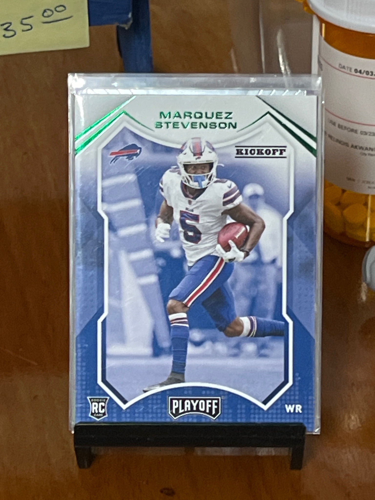 This is an official NFL trading card featuring wide receiver Marquez Stevenson during his tenure with the Buffalo Bills. The card is a 2021 'Playoff' brand release by Panini America. It features a high-gloss finish on typical heavy cardstock, protected here within a transparent soft sleeve and a rigid top-loader. The design includes a central photographic image of Stevenson in a white Bills jersey running with the football against a stylized, blue-hued background. Notable markings include a green foil 'Kickoff' parallel stamp at the top right, a 'ROOKIE CARD' (RC) shield in the bottom left corner, and the official Panini 'Playoff' logo at the bottom center. The card edges appear crisp, though a minor horizontal surface scratch or print line is visible running through the left side of the player's jersey and background. The white and blue geometric borders are clean, and the green foil lettering of the player's name remains vibrant. The reverse side (not visible) would typically contain player statistics and the card number. This specific parallel version was likely distributed in specialized retail or hobby packs as a limited production variant of the base rookie set.