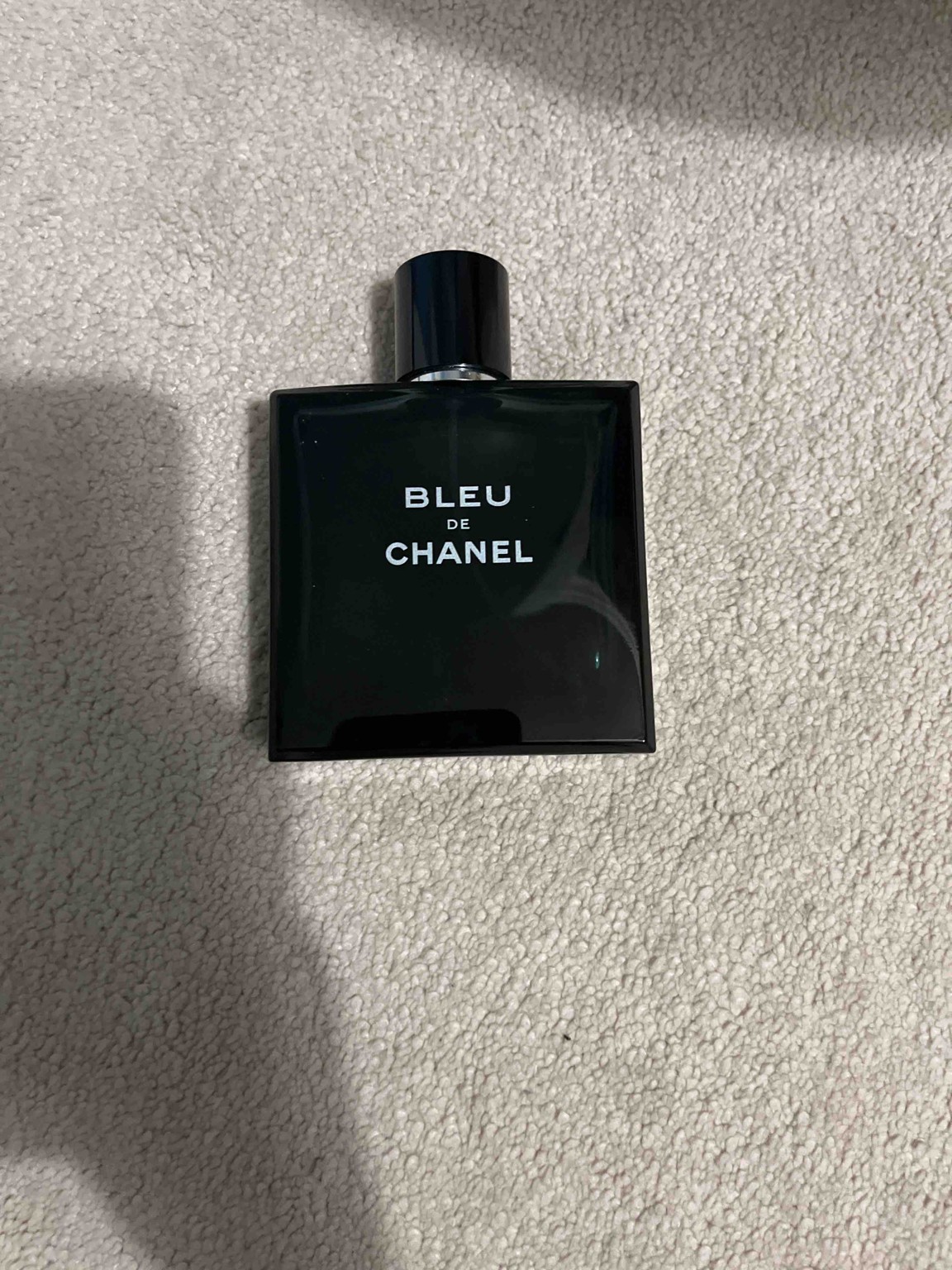 This is a bottle of 'Bleu de Chanel' by the luxury fashion house Chanel. The item is a sleek, square-shaped glass bottle with rounded edges, finished in a deep navy blue, almost black, translucent glass. It features a minimalist design with 'BLEU DE CHANEL' printed in a clean, sans-serif white font centered on the front face. The bottle is fitted with a cylindrical black magnetic cap, a signature design element of the Chanel fragrance line. The overall construction is heavy and substantial, indicating high-quality materials. Based on the lack of additional text like 'Eau de Parfum' or 'Parfum' beneath the brand name on the front, this identifies as the original Eau de Toilette formulation, first launched in 2010. The condition appears to be excellent with no visible chips or scratches on the glass surface and a clean cap. The liquid level inside suggests the bottle is partially full. The design reflects a modern, masculine aesthetic characteristic of 21st-century luxury fragrance packaging.
