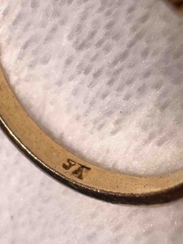 This item is a narrow jewelry band, appearing to be crafted from yellow gold based on the color and distinctive maker's mark. The most notable feature is the incised 'JA' hallmark with a small candelabra or cross-like symbol between the initials, which is the registered trademark for James Avery Artisan Jewelry. The piece features a high-polish finish on the interior and a slightly rounded profile. Condition-wise, the band shows significant signs of wear and age, including a dense pattern of micro-scratches, small pits, and a darkened patina along the edges, suggesting frequent use. The stamping is relatively crisp but shows some smoothing from friction. James Avery jewelry is known for its high-quality craftsmanship, particularly silver and gold pieces produced from the mid-20th century to the present. This particular piece appears to be a vintage example given the surface oxidation and wear patterns. The simplicity of the design focuses on structural integrity and brand heritage. The gold exhibits a warm, buttery hue characteristic of 14k or 18k alloys commonly used by this maker.