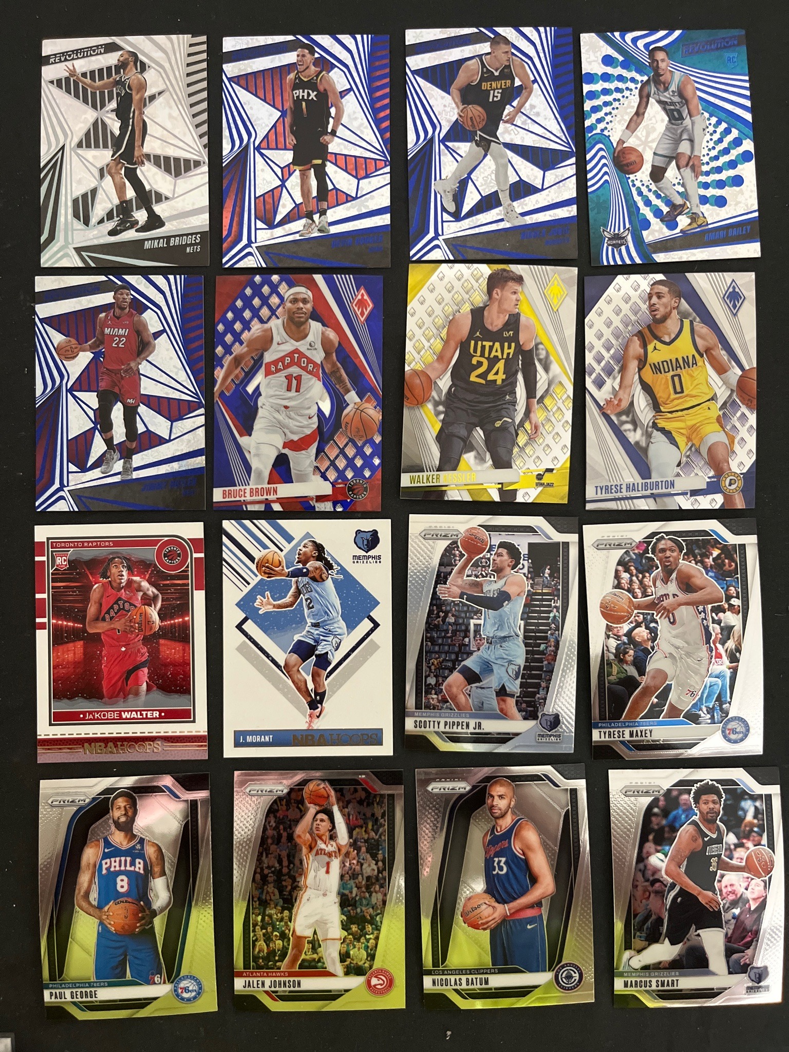 This is a collection of 16 modern NBA trading cards, primarily from the 2023-2024 production season, featuring various Panini brands including Revolution, Phoenix, NBA Hoops, and Prizm. The collection includes notable players such as Tyrese Haliburton, Ja Morant, and Tyrese Maxey, along with rookies like Ja'Kobe Walter and Amari Bailey. Physically, the cards are standard 2.5 by 3.5 inches, printed on premium cardstock with diverse finishes: 'Revolution' cards feature prismatic, geometric foil backgrounds; 'Phoenix' cards have a heavy chrome finish with vibrant team colors; and 'Prizm' cards utilize a signature silver metallic tech. The visual condition of the cards appears to be 'Near Mint' to 'Mint' based on the sharp corners, clean edges, and centered surfaces visible through the image. There are no obvious signs of surface scratching, creasing, or edge chipping, though some cards show slight natural bowing typical of chrome-finished stock. Special markings include the 'RC' (Rookie Card) logo on the Amari Bailey and Ja'Kobe Walter cards. The collection represents contemporary 'hobby' and 'retail' market sports collectibles characterized by high-gloss printing and serial-ready manufacturing standards.