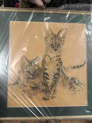 This item is a framed wildlife sketch depicting two serval cats (Leptailurus serval), a medium-sized African wild cat. One cat is shown sitting upright while the other is reclining beside it. The artwork is rendered in what appears to be a mixed media of charcoal and graphite on tan-toned paper, giving it a soft, naturalistic aesthetic. The fine detailing on the spotted fur and large ears shows a high level of craftsmanship and careful observation of animal anatomy. The piece is matted with a deep forest green mat and housed in a slender gold-toned metallic or gilded wood frame. The entire assembly is currently wrapped in protective plastic film, which causes surface glare in the documentation photographs but suggests the item has been stored with care. The condition appears decent, with no immediate signs of moisture damage, though light waviness in the paper may be present under the plastic. The style is indicative of late 20th-century wildlife illustration, likely from the 1980s or 1990s. While a specific artist signature is obscured by the glare and wrapping, the quality suggest a professional illustrator or specialized wildlife artist.