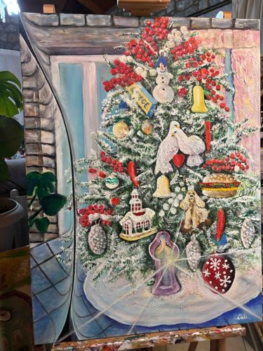This is an original representational oil or acrylic painting on a 24" x 36" (2'x3') vertical canvas by the artist Dale Haessly. The composition features a heavily flocked, densely decorated Christmas tree set against an interior backdrop of a stone or brick wall and a window. The tree is adorned with a variety of eclectic ornaments including a snowman topper, white doves with a red heart, a golden bell, a hamburger, a cocker spaniel dog, several red chili peppers, white pinecones, a church, and a purple nativity figure. A notable feature is the large red ornament with white snowflake patterns in the lower right and a glowing star effect emanating from the nativity scene. The color palette is vibrant, dominated by festive reds, greens, and whites with a textured, impasto-like application that provides significant depth and dimension to the 'snow' on the branches. The work is signed 'Dale' in the bottom right corner in white cursive. The piece appears to be in excellent contemporary condition with no visible cracking (craquelure), fading, or structural damage to the canvas. The craftsmanship reflects a folk-art influenced style with a focus on narrative and sentimental iconography. The perspective is slightly forced, incorporating a curved architectural element on the left that frames the tree. The overall quality suggests a dedicated contemporary studio practice with a high attention to detail in the varied textures of the individual ornaments.