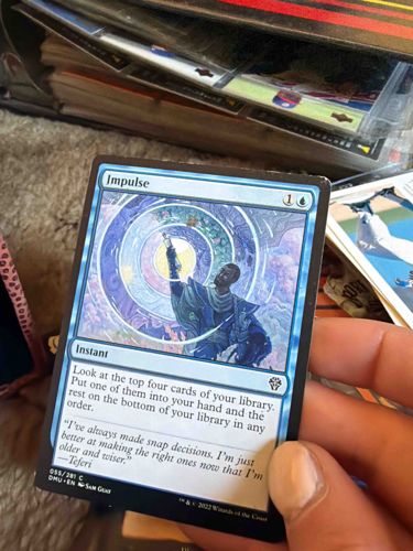 This is a standard-sized collectible trading card from the Magic: The Gathering 'Dominaria United' (DMU) set, released in 2022. The card features a blue color identity, denoted by the blue border framing the central artwork and the mana cost symbol (one generic and one blue) in the upper right. The artwork by Sam Guay depicts the character Teferi amidst swirling magical energy. The card's text defines it as an 'Instant' with rules text regarding drawing and ordering cards from a player's library, followed by flavor text attributed to Teferi. Key identifiers include the set abbreviation 'DMU' and the collector number '055/281' in the bottom left corner, alongside the artist credit. The condition appears to be 'Lightly Played' to 'Moderately Played,' showing visible whitening and wear along the top and right edges, particularly at the corners. There are signs of surface scuffing and edge nicks that impact the black border, suggesting it has been handled without a protective sleeve. The card is printed on standard cardstock with a matte finish characteristic of modern Wizards of the Coast production.