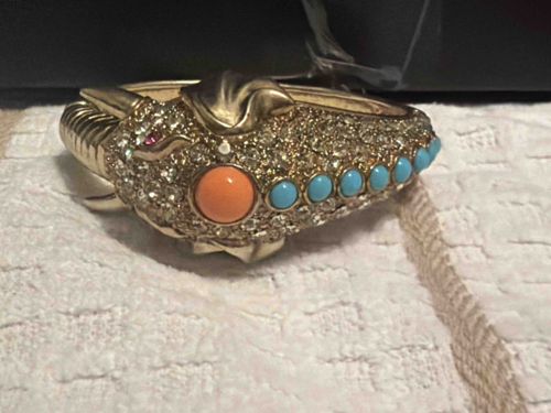 This is a vintage-style hinged bangle bracelet featuring a figural elephant head design, characteristic of the jewelry produced by Kenneth Jay Lane in the late 20th century. The piece is constructed from a heavy gold-tone base metal with a polished finish. The elephant head is densely encrusted with clear, round-cut pave-set rhinestones that provide a high level of brilliance. At its center is a large, cabochon-cut faux coral stone in a vibrant salmon-orange hue, flanked by a row of smaller turquoise-colored enamel or glass cabochons along the side of the head. The elephant's eye is accented with a small marquise or round red rhinestone to mimic a ruby. Structural details include a ribbed gold-tone trunk and stylized ears. The bracelet features a spring-loaded hinge mechanism for ease of wear. Condition appears excellent with no visible loss of stones or significant wear to the gold plating, suggesting it has been well-maintained. This style reflects the Hollywood Regency and maximalist aesthetic popular in the 1960s through the 1980s, emphasizing bold colors and whimsical animal motifs.