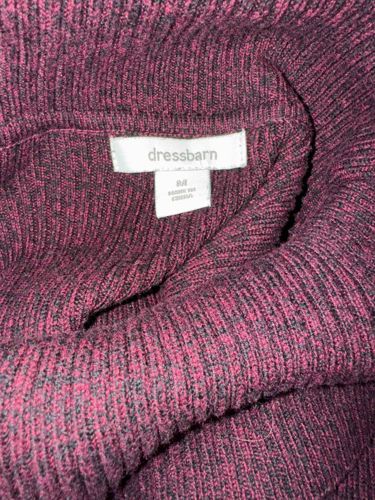 This garment is a contemporary women's sweater featuring a distinct ribbed knit construction in a rich marled burgundy and black color scheme. The item is characterized by a heavy-gauge knit pattern that provides a textured, dimensional aesthetic. Centrally located on the inner neckline is a white woven fabric brand label with the name 'dressbarn' in lowercase gray lettering, accompanied by a smaller secondary white size tag indicating 'M/M' and 'MADE IN CHINA'. The design features a voluminous cowl neck style, constructed by overlapping layers of the ribbed material to create a draped effect around the collar. The marled yarn effect is achieved by intertwining saturated wine-red fibers with dark charcoal or black threads, common in early to mid-21st century mass-market apparel. In terms of condition, the knit shows some light surface pilling and minor fuzziness consistent with moderate wear, but the structure remains intact without visible snags, holes, or unraveling at the seams. The stitching on the label is secure, and the overall craftsmanship is typical of high-volume commercial garment production. This particular style was popular throughout the 2010s for business-casual and everyday wear.