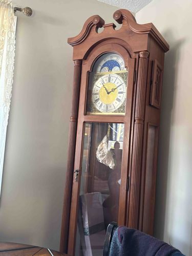 This is a tall-case or 'grandfather' clock featuring a classic cherry or medium-toned wood construction. The case is crowned with a traditional broken swan-neck pediment and a central turned finial block, though the finial itself is currently absent. Flanking the dial and lower case are reeded pilasters with turned capitols, adding an architectural element to the design. The dial face is ornate, showcasing a silver-toned chapter ring with Roman numerals, an interior brass-toned center, and elaborate gold-toned corner spandrels. Additionally, the clock features a stationary or decorative moon phase sub-dial in the arched top. The lower portion contains a long glass waist door, currently revealing that the internal weights have been wrapped in protective material, suggesting recent transport or storage. The overall style is reminiscent of late 20th-century reproductions by makers such as Howard Miller or Ridgeway. The wood appears to be in good condition with a consistent satin finish, though there are minor scuffs visible along the base and the aforementioned missing finial. The clock exhibits high-quality joinery and traditional proportions characteristic of early American revival furniture.