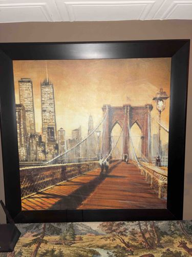 This is a large-scale, framed canvas wall art piece depicting a sepia-toned cityscape of New York City. The composition prominently features the Brooklyn Bridge walkway leading into Lower Manhattan, with the distinctive silhouettes of the original World Trade Center Twin Towers visible in the background. The color palette is dominated by warm ochre, amber, and deep brown tones, suggesting an evening or sunset setting. The artwork appears to be a digital print on canvas with textured gel or hand-applied brushstrokes to simulate the look of an oil painting. It is enclosed in a substantial, dark espresso or black wood-composite frame with a wide, flat profile that enhances its modern aesthetic. The scale of the towers suggests this piece was created or inspired by photography taken prior to September 2001, though the manufacturing of the physical decorative piece likely dates to the early 21st century. The condition appears fair to good from the frontal view, though there is a noticeable diagonal glare across the right-center portion of the canvas. The frame shows some dust but no immediate signs of structural damage or significant chipping. The use of perspective draws the eye toward the center of the bridge, create a sense of depth against the verticality of the skyscrapers. This type of oversized wall decor is commonly found in home staging and contemporary interior design environments.