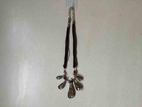 This item is a contemporary bib-style statement necklace featuring a multi-strand cord and organic decorative elements. The upper portion of the necklace is constructed from multiple thin cords, likely waxed cotton or silk, in a dark chocolate brown or black hue, which lead to a silver-toned metal extender chain and lobster-style clasp. The focal point is a decorative center section comprising five irregularly shaped, metallic-finished drops that resemble abstract petals or melted organic forms. These drops exhibit a hammered or textured surface with a high-shine pewter or darkened silver finish. Interspersed between these metallic drops are small white freshwater pearls and dark, possibly garnet-colored or amber glass beads, which provide color contrast and a naturalistic aesthetic. The construction utilizes crimp beads and metal loops to secure the components, indicating hand-assembled boutique jewelry. While no visible maker's mark is present, the style is characteristic of late 20th to early 21st-century artisanal jewelry, specifically mimicking the organic 'brutalist' revival often seen in contemporary design. The overall condition appears good with minor surface tarnish on the metal components and some slight kinking in the cord strands from storage.