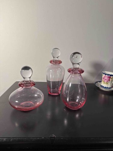 This set consists of three hand-blown glass perfume flacons of varying silhouettes, including a broad squat orb shape, a tall tapered cylinder, and a classic pear-shaped vessel. Each piece is crafted from transparent glass featuring a delicate cranberry or rose-pink ombre effect that transitions from a concentrated, saturated base to clear glass at the shoulder. The bottles are finished with matching pink-rimmed collars and topped with solid, clear glass spherical bubble stoppers. The craftsmanship suggests mid-20th-century Murano or Scandinavian influence, characterized by smooth, fire-polished surfaces and a lack of visible mold seams. The glass is clear with minimal internal occlusions, indicating a high level of artisanal quality. Each stopper appears ground to fit its specific neck for an airtight seal. Condition-wise, the set presents beautifully with no visible chips, cracks, or heavy clouding. There is light surface wear consistent with age, particularly on the base of the vessels where they meet the table. No visible maker's marks or signatures are apparent in the image, but the consistency of the pink hue across the three distinct shapes indicates they were produced as a coordinated vanity set. The minimalist, fluid lines suggest a Mid-Century Modern aesthetic.