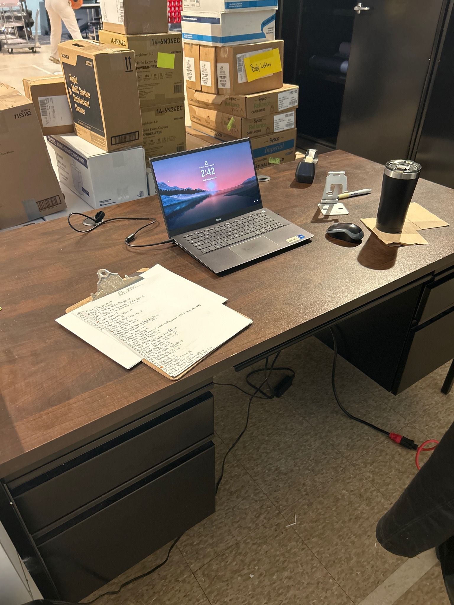 This is a contemporary Dell Latitude laptop, likely from the 5000 series (such as a 5420 or 5430 model), featuring a sleek dark gray or 'Titan Gray' chassis constructed from reinforced plastics and carbon fiber. The device is a standard clamshell design with a 14-inch matte display showing a Windows lock screen with a timestamp of 2:42. The keyboard is a chiclet-style backlit layout in a slightly darker charcoal finish, complemented by a large integrated multi-touch trackpad. Visible on the right palm rest is a blue Intel Core i5 or i7 sticker, indicating a modern processor generation. The screen features narrow side bezels with a standard top bezel housing an integrated webcam and privacy shutter. The overall condition appears excellent with minimal visible surface wear, though minor fingerprint smudging is present on the trackpad area. The laptop is powered via a proprietary Dell barrel-style or USB-C power adapter visible plugged into the left side. It represents a professional-grade business machine known for durability and hardware security features, typically dating from the early 2020s.