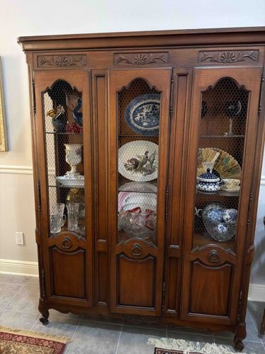 This is a significant three-door display cabinet from Drexel's 'French in the Country Manor' collection, dating to the mid-20th century. The piece is constructed from premium hardwoods, likely walnut or pecan, and features a warm, medium-toned honey oak finish that emphasizes the natural wood grain. The cabinet showcases a French Provincial influence, characterized by arched door panels, scalloped aprons, and elegant cabriole legs. A distinguishing feature is the wire-mesh (chicken wire) grille-work over glass in the upper door panels, a hallmark of the rustic 'Country French' style. The top of the cabinet is accented with carved shell or palmette motifs on the frieze. Each door is outfitted with decorative circular ring pulls and long vertical barrel hinges. The interior houses multiple glass shelves used for displaying collectibles, ceramics, and glassware. The overall craftsmanship reflects Drexel’s mid-century reputation for high-quality mass-produced furniture, exhibiting sturdy joinery and consistent finish application. The condition appears excellent with a well-maintained patina and no visible structural damage, though minor surface scuffs associated with age may be present on the lower panels.