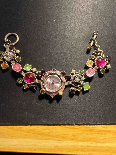 This is a highly decorative charm-style bracelet watch featuring an eclectic, maximalist aesthetic. The central focal point is a small circular watch face with a light pink dial and Arabic numerals, surrounded by a twisted rope-texture bezel. The bracelet is constructed from a silver-toned base metal, possibly pewter or silver-plated brass, with an antiqued patina finish. It is heavily embellished with an array of multi-colored faux gemstones and glass cabochons in shades of magenta, lime green, amber, and deep burgundy, along with small cream-colored faux pearls. The piece includes various figural charms, notably a pink enameled dragonfly and a rose blossom. The charms are mixed shapes (squares, ovals, and rounds) and are fixed along the chain links. It features a toggle clasp closure consisting of an O-ring and a T-bar. The style is reminiscent of early 2000s costume jewelry brands such as Sweet Romance or Kirks Folly, characterized by romantic, whimsical themes and layered textures. Condition appears good with minor signs of oxidation on the metal surfaces and possible light scratches on the watch crystal; however, the functional state of the quartz movement is unverified.