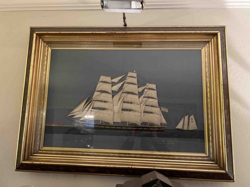 This item is a detailed maritime shadowbox or 'woolwork' style relief art piece, depicting a large three-masted clipper ship in full sail, accompanied by a smaller schooner to its right. The larger vessel is meticulously constructed with off-white or cream-colored fabric sails, which appear to have a three-dimensional curved form to simulate wind. The rigging is intricate, utilizing fine threads to represent the complex lines of a sailing ship. The hull is dark, likely black or deep brown, featuring a row of white gunports or cabin windows. The background is a muted steel-blue, providing a stark contrast that highlights the white sails. The artwork is housed in a substantial, ornate multi-tiered frame. The frame features an outer band of dark wood with a mottled or burl walnut-style finish, followed by several inner gilded (gold-toned) moldings, including a stepped profile and a decorative beaded or rope-twist border near the glass. There is visible text in the bottom right corner, which likely identifies the vessel or the artist, though it is slightly obscured by glares. The condition of the frame shows some minor surface wear and dust accumulation consistent with age, particularly on the upper edges. The interior art appears well-preserved behind glass, though there may be slight yellowing of the sail material over time. Based on the style and framing, this piece likely dates from the mid-to-late 20th century, drawing inspiration from 19th-century maritime traditions. The craftsmanship displays high attention to nautical detail, particularly in the rigging and sail positioning.