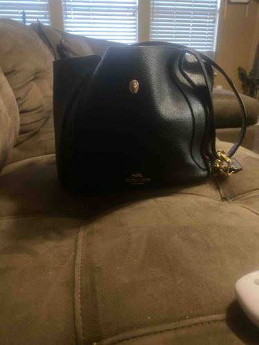 This is a contemporary Coach Town Bucket Bag, a mid-sized designer handbag crafted from black polished pebble leather. The bag features a structured base with a soft, slightly slouchy bucket silhouette. It is detailed with gold-tone hardware, including a prominent Coach 'Horse and Carriage' logo plaque at the bottom front and a circular gold grommet or fastener at the center top. The interior typically consists of two main compartments separated by a central zip pocket, though only the exterior is visible here. It includes both a top handle and a detachable shoulder/crossbody strap, seen draped to the right side. The bag shows signs of high-quality craftsmanship with reinforced tonal stitching and finished leather edges. Condition appears very good with no visible scratches or scuffs to the leather, though there is a soft crease in the material consistent with the bucket style and light use. This modern style is part of the Coach outlet or retail collections from the late 2010s to early 2020s, reflecting a timeless minimalist design with durable materials.