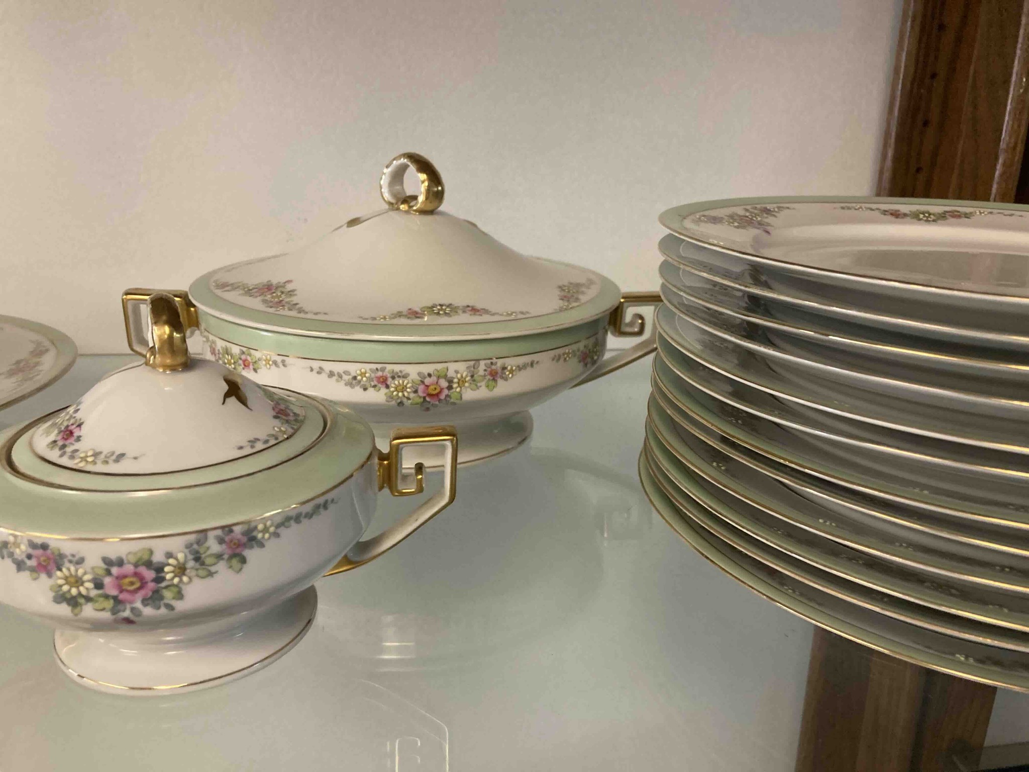 This is a grouping of fine porcelain tableware from Rosenthal, specifically identified as 'The Montrose' pattern. The set includes a footed sugar bowl with lid, a matching lidded vegetable tureen, and a stack of approximately ten dinner plates. The pieces are crafted from high-quality white vitreous porcelain featuring a distinctive wide seafoam green (celadon) border and hand-painted or high-quality transfer floral sprays of pink roses and blue forget-me-nots. A hallmark of this service is the heavy application of 22k gold gilding on the angular Art Deco-style handles, the finials, and the scalloped rims. The construction reflects mid-20th-century German manufacturing, likely dating between the 1940s and 1950s. The handles exhibit a unique geometric, squared 'greek key' influence, while the lids are notched to accommodate serving spoons. Condition appears excellent with no visible chips or cracks; however, there is minor rubbing to the gold gilding on the high points of the sugar bowl handles. The glaze remains bright with no evidence of significant utensil marks or crazing, indicating the set was well-maintained and likely used only for formal occasions.