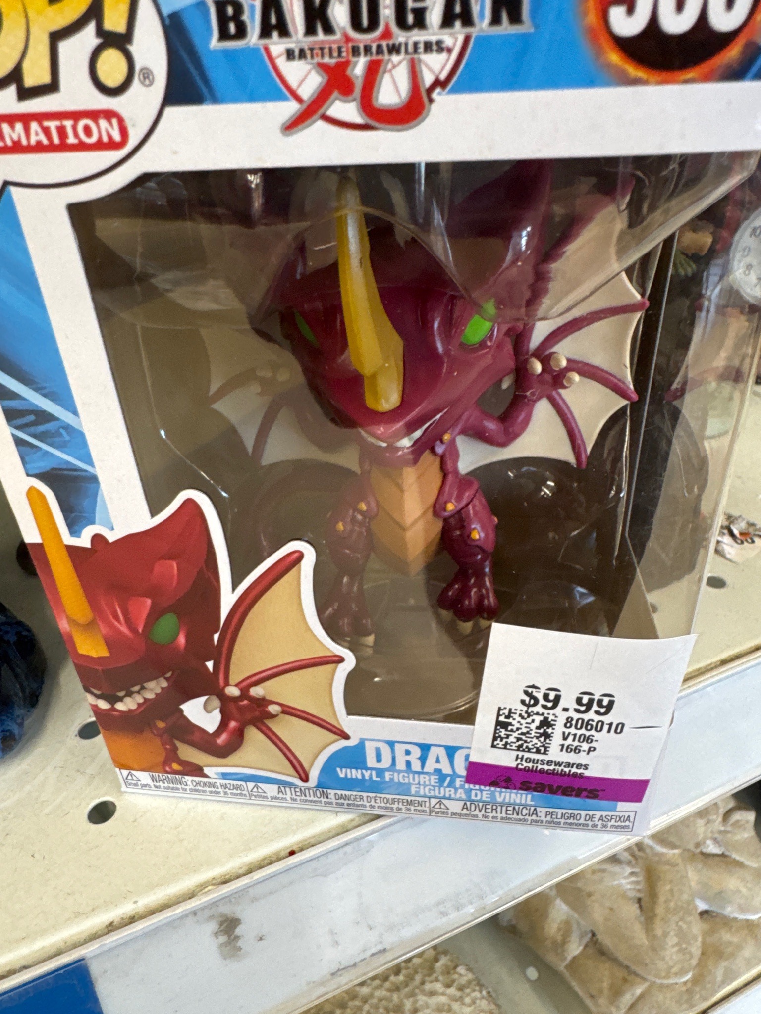 This is a mass-produced vinyl figurine from the popular Funko Pop! Animation line, specifically representing the character Drago (Dragonoid) from the 'Bakugan Battle Brawlers' series. The figure is constructed from molded vinyl and stands approximately 3.75 to 4 inches tall. It features a stylized, maroon-colored dragon aesthetic with a translucent yellow horn, vibrant green eyes, and cream-colored webbing on its wings. The character is depicted in a crouching, dynamic pose. The item is enclosed in its original window-box packaging, though the box shows signs of shelf wear. Notably, a large white and purple price tag from a second-hand retailer (Savers) is adhered to the front plastic window, which may leave adhesive residue if removed. The cardboard packaging includes the 'Bakugan' logo at the top and the 'Animation' sub-brand logo on the side. The craftsmanship is typical of modern pop-culture collectibles produced in the early 2020s, featuring clean paint applications but standard industrial molding seams. There are no visible custom modifications or signatures; it remains an after-market retail item in 'good-to-fair' condition due to the external labeling and minor edge blunting on the cardstock.