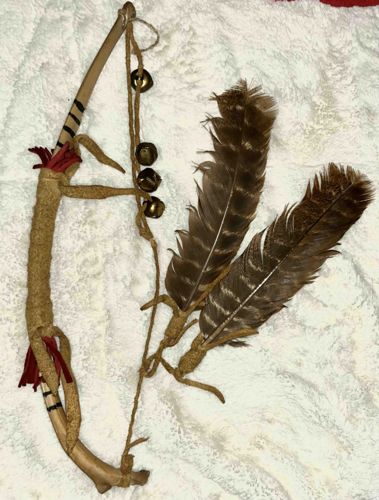 This is a decorative, small-scale bow crafted from a natural curved wooden branch. The piece is highly ornamented in a style reminiscent of Native American-inspired souvenir art. The central grip or riser is wrapped in a tan-colored suede or leather material, bordered by distinctive red fringed leather accents. The wood itself shows dark horizontal banded markings, likely burnt or painted for aesthetic effect. Attached to the fiber string are four aged brass-tone sleigh bells (crotal bells) and two large, natural striped bird feathers, possibly from a turkey, which are secured with matching leather strips. The construction appears to be for display or ceremonial use rather than functional archery, as evidenced by the tension of the string and the thinness of the limb. The condition is fair, showing signs of shelf wear, light fraying on the fiber string, and minor dust accumulation on the feathers. No visible maker's marks or signatures are present, suggesting it is a late 20th-century artisan or souvenir piece. The craftsmanship is rustic, utilizing natural materials and simple knotting techniques to achieve a folk-art aesthetic.