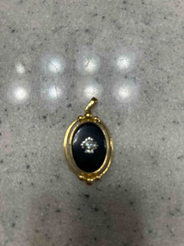 This item is an elegant oval-shaped pendant featuring a central black onyx cabochon. The onyx is smooth and polished, exhibiting a deep, uniform black color without visible inclusions. Set into the direct center of the onyx is a small diamond accent, likely single-cut or round brilliant, housed within a white-tone starburst or rhomboid-shaped metal setting that provides a sharp contrast against the dark stone. The main body of the pendant is constructed from what appears to be yellow gold, consisting of a double-rimmed oval frame. The outer frame features decorative gold bead or granulation details at the top and bottom poles, enhancing its neoclassical or Victorian-revival aesthetic. A tapered gold bail is attached to the top for suspension from a chain. The craftsmanship suggests a mid-to-late 20th-century origin, likely a piece of fine fashion jewelry. In terms of condition, the gold shows minor surface scratches consistent with light wear, and the onyx appears free of chips or cracks. There are no visible maker's marks or hallmarks in the provided image, though they would typically be located on the bail or the back of the setting. The overall quality is characteristic of solid 10k or 14k gold jewelry.