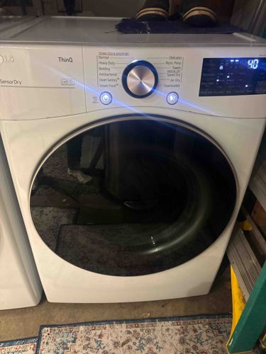 This is a modern, front-loading domestic clothes dryer manufactured by LG, specifically part of their ThinQ smart appliance line. The unit features a white enameled steel exterior with a large, circular dark-tinted glass door framed in black. The control panel is located at the top and includes a central metallic rotary selector dial used to navigate various cycles such as Normal, Heavy Duty, Bedding, and Steam Sanitary. To the right of the dial is a digital LED display showing a remaining time of 40 minutes, surrounded by touch-sensitive buttons for further customization of heat and time levels. The 'LG' and 'ThinQ' logos are clearly visible on the top left, alongside 'Sensor Dry' branding. The unit appears to be in good functional condition with its internal lights and display active. Minor cosmetic wear is visible on the surface, including some light scuffing on the side panels and dust accumulation on the top surface. This model is representative of high-end consumer appliances from the circa 2018-2023 period, emphasizing energy efficiency and wireless connectivity features.