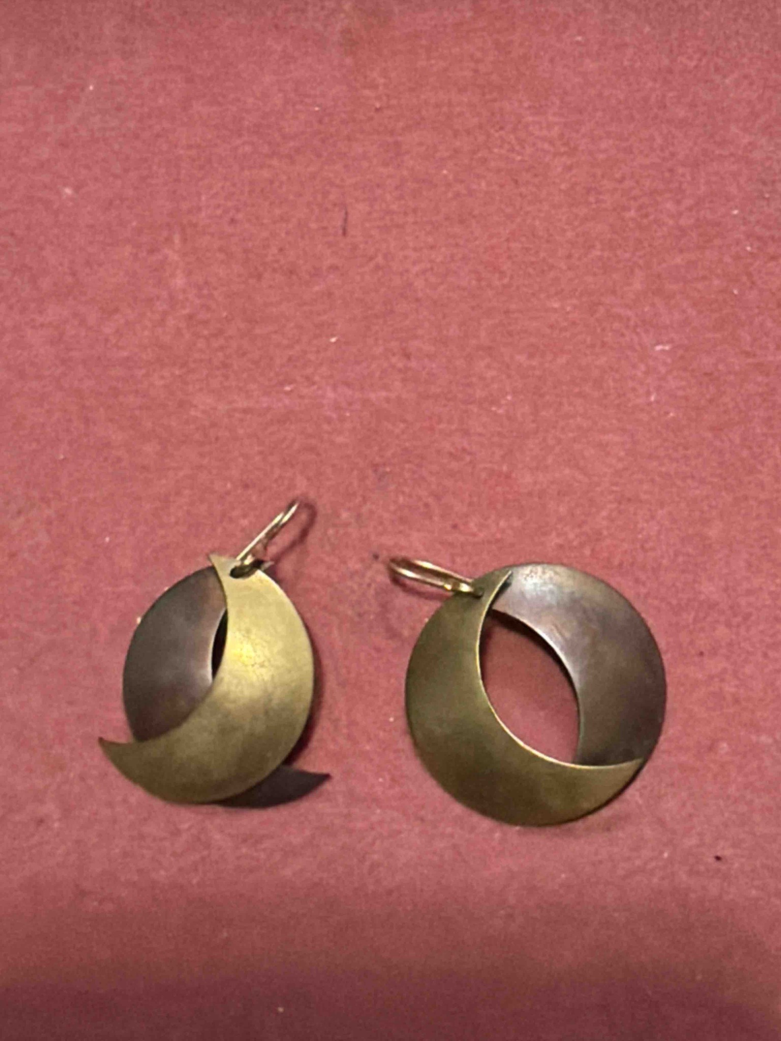 This is a pair of handcrafted dangle earrings featuring a modernist celestial design. Each earring is composed of two overlapping circular elements: a darkened copper or bronze-tone disk in the background and a contrasting brass or gold-tone crescent moon silhouette in the foreground. The construction uses a layering technique where the crescent is riveted or soldered onto the base metal, creating a three-dimensional effect with a central cutout. The metals exhibit a matte, brushed finish with a visible aged patina, particularly on the darker base disks which show subtle signs of oxidation and surface wear consistent with age. They are suspended from simple wire hooks, likely made of a base metal or gold-plated alloy, which appear slightly bent from use. While no maker's marks are visible in the image, the style is reminiscent of mid-to-late 20th-century artisan jewelry, possibly from the 1970s or 1980s. The craftsmanship suggests a studio-made or boutique production rather than mass-market manufacturing, given the slight asymmetry between the two pieces. There are minor scratches and tarnish throughout, but no major structural damage or missing components.