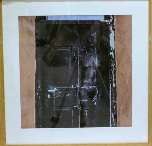This is a contemporary mixed-media or photographic work of art, likely a gel transfer or heavily processed silver gelatin print, by an unknown artist. The central image features a monochromatic, ghost-like silhouette of a human figure standing within a weathered, paneled door frame. The figure and the door exhibit a distressed, high-contrast aesthetic with visible cracking and peeling effects, suggesting a physical manipulation of the medium. Flanking the central darkened panel are two vertical bands of earthy, terracotta-toned pigment, providing a warm contrast to the stark black and white interior. The work is professionally matted with a clean white window mount and housed in a light-grained wood frame, potentially oak or pine. Regarding condition, the image surface shows intentional stylistic distressing, while the glass exhibits reflections that may obscure fine surface details. The frame appears stable but shows minor surface scuffing characteristic of late 20th to early 21st-century pieces. The craftsmanship suggests a deliberate exploration of texture, absence, and architectural space, typical of experimental fine art photography or contemporary printmaking from the 1990s through the present day.