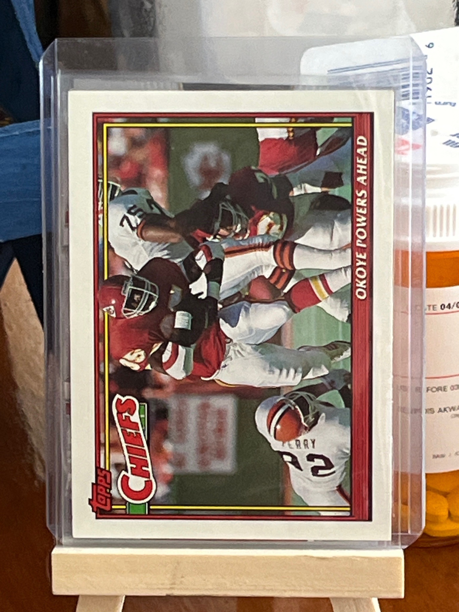 This is a 1991 Topps football trading card featuring Kansas City Chiefs fullback Christian Okoye, titled 'Okoye Powers Ahead.' The card features a landscape (horizontal) orientation, measuring approximately 2.5 by 3.5 inches, printed on standard 1990s-era cardboard stock. The action photograph depicts Okoye in his red Chiefs uniform breaking through a tackle by Cleveland Browns players. The design includes a dual-border system: a thin yellow line immediately surrounding the image and a thick burgundy outer border. The 'Topps' brand logo is located in the bottom left corner, adjacent to a stylized 'CHIEFS' team logo. The text 'OKOYE POWERS AHEAD' is printed vertically along the right edge. In terms of condition, the card is housed in a clear protective plastic top-loader, which has preserved its state. The centering of the image appears slightly shifted toward the top edge (left side in horizontal view). The corners appear relatively sharp with minimal white chipping visible on the burgundy borders, which are notoriously prone to showing wear. The surface finish is matte, typical for Topps cards of this era. This card is part of the junk wax era of sports card collecting, produced in 1991 during high-volume manufacturing cycles. Despite being widely available, the card remains a nostalgic piece for fans of 'The Nigerian Nightmare' and early 90s NFL history.