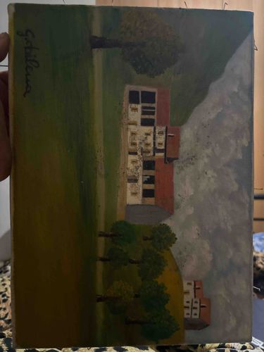 This is an original landscape painting executed in a Naive or Folk Art style, depicting a cluster of rural buildings situated in an open green field. The work is rendered on a rectangular support, likely canvas or board, and features a palette dominated by earthy greens, yellows, and muted greys. The composition includes a central two-story structure with a red roof, flanked by smaller architectural details and stylized trees. A signature which appears to read 'Galilua' or 'Gatilua' is prominently located in the upper left corner of the vertical orientation. The brushwork is flat and lack-depth, characteristic of amateur or mid-20th-century folk traditions. Condition-wise, the piece shows significant signs of age and neglect; there are visible abrasions, surface dirt, and notable paint loss/flaking in the center of the larger building. The edges show signs of fraying or wear where it may have been previously framed. Small pinholes are visible along the top edge, suggesting it was once tacked to a surface. The piece lacks a professional finish, which adds to its rustic, vernacular charm. Based on the materials and stylistic execution, it likely dates to the mid-to-late 20th century.