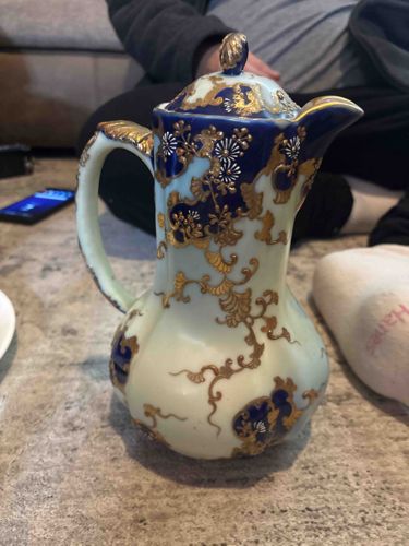 This is a tall, porcelain or fine earthenware chocolate pot featuring a distinct 'Flow Blue' or cobalt glaze application with heavy moriage and gilded detailing. The vessel possesses a bulbous body that tapers into a slender neck with a flared pouring lip and a decorative, scrolled handle. The base color is a pale celadon or off-white. The decoration consists of deep cobalt blue cloud-like patches heavily accented with raised gold (moriage) enameled flowers, likely chrysanthemums, and elaborate gilded scrollwork and vine motifs trailing down the body. The lid is domed with a matching cobalt and gold shell-form finial. In terms of condition, there is visible rubbing and wear to the gold gilding on the handle and edges of the spout, consistent with age and frequent handling. There is a slight patina of dust in the recessed areas of the moriage, but no significant cracks or large chips are immediately apparent. The craftsmanship indicates a late 19th-century to early 20th-century (Meiji era or early Showa) origin, specifically designed for the Western export market as evidenced by the chocolate pot form. The intricate application of the raised gold and the depth of the cobalt blue are indicators of high-quality decorative ceramic production, common in regions like Yokohama or the Satsuma workshops.