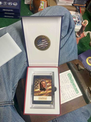 This item is a limited edition 'Word from the Past' historical trading card featuring the 10th U.S. President, John Tyler. The card is presented in a premium blue and white commemorative flip-top display box with red piping, featuring a circular gold foil seal on the inner lid displaying the American flag. The card itself is housed in a professional thick plastic screw-down or magnetic slab for preservation. The card's artwork features a central portrait of John Tyler over an antiqued American flag background, with a prominent authentic clipped signature (cut) inlaid at the bottom. The text at the bottom edge identifies the subject as '10th President, John Tyler'. The condition appears excellent with no visible foxing on the signature slip or damage to the protective casing. This modern collectable is designed as a high-end novelty or investment piece specifically for Presidential memorabilia collectors, combining historical primary source material (the autograph) with contemporary graphic design and protective 'slabbed' packaging. The craftsmanship of the presentation box suggests a high-quality commemorative release, likely from a specialist trading card company like Topps or Historic Autographs.