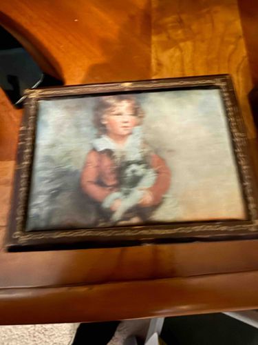 This is a rectangular decorative wooden dresser or trinket box, possibly designed for jewelry or vanity stationery. The lid features an inset lithographic print or decoupaged reproduction of a classic Romantic-era portrait, specifically resembling 'Master Hare' by Sir Joshua Reynolds. The image depicts a young child with fair hair dressed in a rust-colored jacket holding a small dog, rendered in a soft, painterly style with muted earth tones and a hazy background. The box lid is framed by a gold-toned, embossed metallic or gilt gesso border featuring a repeating scrolling or vine-like pattern, which provides a high-contrast accent against the dark wood. The primary material appears to be a stained hardwood or possibly a wood composite with a dark cherry or mahogany finish. Regarding condition, there is visible wear around the edges of the lid, with some scuffing and loss of the gilt finish on the decorative frame. The image inset appears to have some slight yellowing or fading consistent with mid-20th-century decorative household items (c. 1940s-1970s). The box is constructed with straight edges and no visible exterior hinges from the top perspective, suggesting a flush-mount hinge mechanism. The overall craftsmanship suggests a mass-produced decorative piece intended to replicate the upper-class aesthetic of English portraiture.