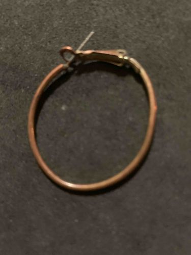This item is a single medium-sized hoop earring featuring a distinctive rose-gold or copper-toned finish. The earring is constructed from a thin, tubular metal wire that has been curved into a circular shape. It utilizes a traditional saddleback (also known as a latch back or click-top) closure mechanism, where a hinged post snaps into a U-shaped groove on the opposite side of the hoop. The material appears to be a base metal, such as brass or steel, with a metallic plating that shows significant signs of wear and age. The surface texture is somewhat irregular, exhibiting significant tarnishing and a dark patina, particularly around the hinge and clasp areas. There are visible areas where the plating has thinned or worn away, revealing a duller metal underneath. Notable condition issues include a slight distortion in the circular shape of the hoop and surface oxidation. No maker's marks or stamps are visible on the clasp, suggesting it is a mass-produced costume jewelry item, likely from the late 20th or early 21st century. The craftsmanship is functional but characteristic of mid-range fashion jewelry rather than fine jewelry.