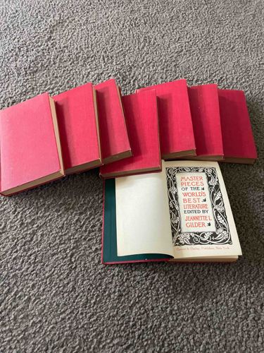 This is a collection of eight small-format pocket-sized books titled 'Masterpieces of the World's Best Literature', edited by Jeannette L. Gilder and published by Current Literature Publishing, New York. Each volume features a red fabric-textured cloth binding with no visible gilding or stamping on the front covers, suggesting an early 20th-century cloth-bound series meant for high-volume distribution (circa 1905-1910). The open volume displays a decorative monochrome title page with an ornate floral and foliate border surrounding the red-and-black printed text. The pages appear cream-toned with some age-related yellowing along the edges. While the cloth covers remain vibrant in color, there is visible tanning and dust-soiling to the exterior text blocks. Several corners show minor bumping, and the bindings appear slightly loosened but intact. The small physical dimensions, roughly 4 by 6 inches, indicate a pocket edition designed for portable reading. The set lacks its original slipcase or individual dust jackets, which is typical for the age and utilitarian nature of this specific edition.