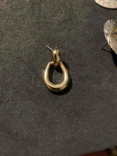 This item is a single post-style earring featuring a polished gold-toned finish. The design consists of a small rectangular or rounded post head that supports a dangling, open hoop in a rounded-bottom 'tear drop' or 'horse bit' shape. The metal exhibits a high-luster surface, though it appears to be costume jewelry rather than solid karat gold, likely consisting of a base metal alloy with gold-colored plating. Physically, it measures approximately 2 to 3 centimeters in length. The construction involves a hinge-like connection between the post and the dangling element, allowing for movement. In terms of condition, the metal shows signs of surface wear, including minor scratches and slight tarnishing, particularly around the articulation joint. The post is straight but lacks a butterfly backing in the image. There are no visible maker's marks or hallmarks on the front or visible sides, which is common for mass-produced fashion jewelry from the late 20th century, specifically the 1980s or 1990s. The style is classic and minimalist, aimed at reflecting the bold, high-shine aesthetic of that era. Despite its simple design, the craftsmanship appears sturdy, with no signs of broken components or heavy pitting.
