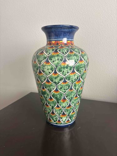 This is a large, hand-painted earthenware ceramic vase executed in the traditional Talavera style of Mexico. The vessel features a classic baluster form, tapering from a wide shoulder down to a narrow base, topped with a flared rim. The exterior is decorated with a vibrant, dense 'plume' or 'scallop' pattern consisting of interlocking fan-shaped motifs. Each plume is hand-detailed with a gradient of forest green, emerald, and yellow, accented by small black dots and orange radiating lines at the base of each scale. The neck and rim are finished in a solid, deep cobalt blue glaze, separated from the main body by a decorative geometric band of orange and yellow circles. The high-gloss glaze provides a vitreous finish that is typical of lead-free modern Talavera production. The craftsmanship shows minor hand-painted variations, which are hallmarks of authentic folk art rather than factory mass-production. Condition appears excellent with no visible cracks, chips, or significant crazing, though some minor shelf wear may be present on the unglazed foot ring. This piece likely dates to the late 20th or early 21st century and represents a high-quality example of contemporary decorative Mexican pottery.