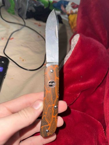 This is a contemporary folding pocket knife, likely of budget-tier manufacture based on the visual construction and the 'Goker' brand association. The knife features a drop-point blade style made of stainless steel, showing a satin finish with significant superficial scratching and wear across the flats. The handle is the most distinguishing feature, composed of synthetic scales (likely G10 or plastic) featuring a high-contrast orange and black topographic or faux-Damascus pattern. The construction utilizes exposed pivot pins and two body pins to secure the scales to the liners. A small circular emblem or logo is embedded in the center of the handle. Regarding condition, the blade shows dulling and numerous surface abrasions consistent with three years of regular use. There is visible pocket lint or debris near the pivot, and the metal edge appears to have some micro-chipping. The handle scales show smoothing from wear but maintain their vibrant color. The knife lacks a pocket clip, suggesting a traditional pocket-carry design. This item represents a utility-grade modern tool rather than a collector's piece, characterized by mass-market manufacturing techniques and synthetic materials intended for daily use.