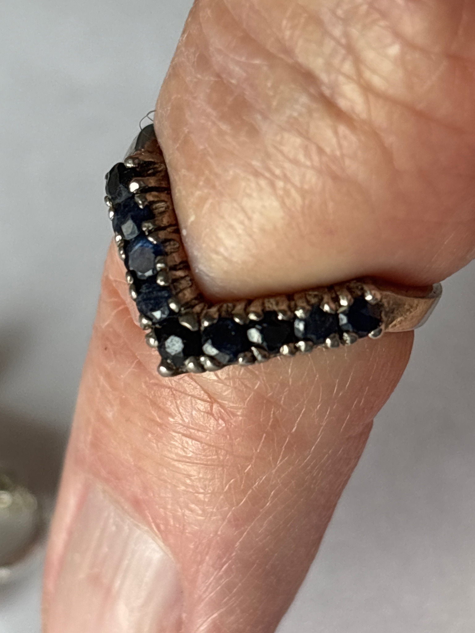 This item is a wishbone or V-shaped contour band, likely intended as a stackable fashion ring or a wedding enhancer. The ring features a series of approximately eleven round-cut dark blue gemstones, identified by their deep indigo hue and slight translucency underneath certain angles as sapphires. Each stone is secured in a classic shared-prong setting, specifically a common-prong arrangement that allows for maximum light entry from the sides while maintaining a sleek profile. The metal appears to be a white-tone alloy, possibly sterling silver or white gold, though it exhibits a warm patina and some surface oxidation consistent with wear. The shank is slim and tapers toward the back, suggesting a late 20th-century or early 21st-century manufacturing style. In terms of condition, there is visible buildup of debris around the prongs and behind the gallery of the stones, which is typical for pre-owned jewelry. Some prongs show minor surface abrasions, but they appear to remain functional in securing the gemstones. No visible hallmarks or maker's marks are distinguishable from this angle, but the craftsmanship suggests a commercial production grade rather than a bespoke artisan piece. The deep, almost black saturation of the sapphires is a common characteristic of commercial-grade stones sourced from regions like Australia or Thailand.