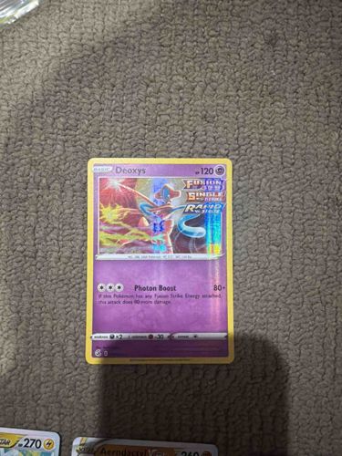 This is a non-authentic or 'proxy' Pokémon trading card featuring the character Deoxys. Physically, it is a standard-sized card printed on cardstock with a yellow border and purple background elements intended to represent a Psychic-type Pokémon card. It features an illustration of Deoxys in its Normal Form, accompanied by logos for 'Fusion Strike', 'Single Strike', and 'Rapid Strike'. The card text lists an HP of 120 and the move 'Photon Boost'. However, there are numerous red flags indicating this is a counterfeit product. Most notably, the font used for the 'HP 120' and 'Deoxys' name is incorrect and lacks the proper spacing and typeface used by the official manufacturer, The Pokémon Company International. The holo-foil effect is a vertical 'rainbow' stripe that is common on low-quality bootlegs, whereas the authentic card from the Fusion Strike expansion (card #120/264) features a subtle 'cosmos' or 'holographic sheen' that does not obscure the text in this manner. Furthermore, having all three strike styles (Fusion, Single, and Rapid) on one card is not a valid mechanic for this specific card print, making it a 'fantasy' misprint often found in flea market card packs. The card displays minor edge wear and surface scratching, and the centering of the print is noticeably off-balance.