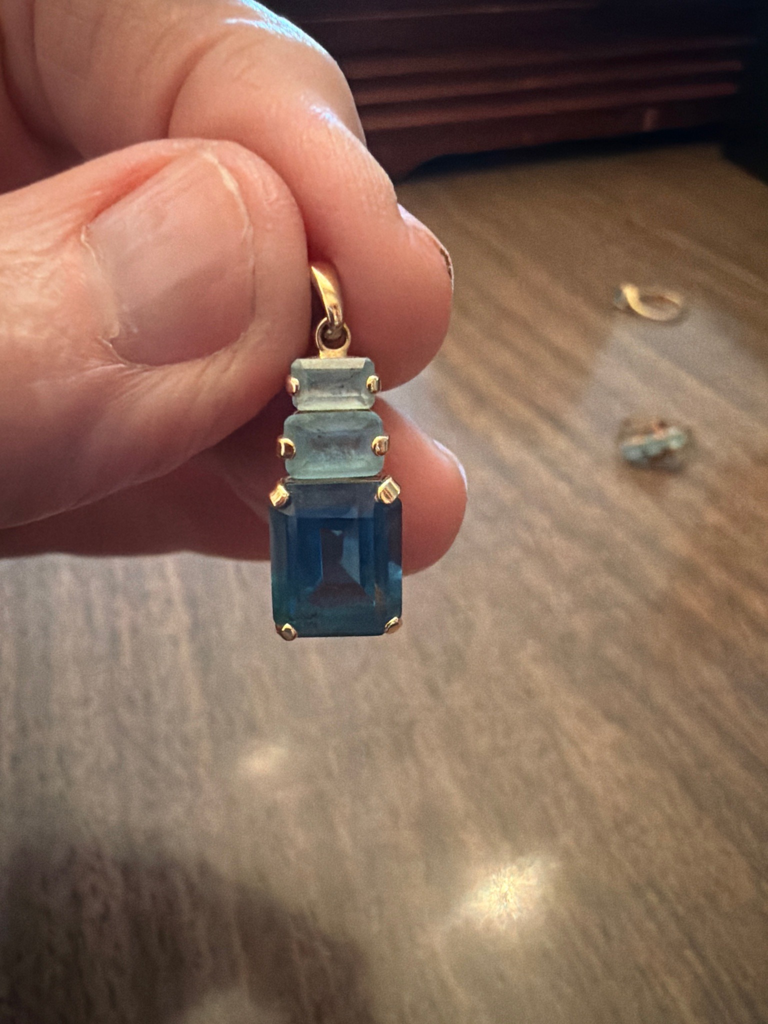 This is a vertical drop pendant featuring three graduated, emerald-cut gemstones set in 14k or 18k yellow gold. The bottom and largest stone appears to be a London Blue Topaz, characterized by its deep, saturated teal-blue hue. Above it are two smaller, graduated stones with a much lighter, sea-foam blue tone, consistent with Aquamarine or light blue Swiss Topaz. Each stone is secured by a four-prong setting with polished gold tabs. The overall construction displays a 'step' or 'ladder' design, common in late 20th-century jewelry (circa 1980s-1990s). The metal shows a bright, reflective finish with minimal visible scratching, though some light patina is present on the underside of the prongs. The stones appear to have good clarity with significant light return through the table facets, indicating quality lapidary work. The pendant is suspended from a simple, polished gold tapered bail. There are no visible maker's marks or hallmarks on the front, but the design suggests a mass-market fine jewelry piece of high-quality craftsmanship, likely intended for a formal or cocktail attire set.