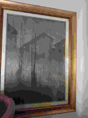 This item is a large-format rectangular artwork, likely an oil or acrylic painting on canvas, housed in a substantial wooden frame. The frame features a classic cove profile with a lustrous gold-toned or gilt finish, accented by a white inner linen liner or painted slip that provides a visual transition between the frame and the art. The painting itself is executed in an impressionistic or tonalist style, characterized by a muted color palette dominated by earthy greys, ochres, and dark umbers. It appears to depict an architectural subject, possibly a courtyard or a street scene with tall, slender vertical elements that could represent trees or architectural columns. The brushwork seems fluid and atmospheric, prioritizing mood over precise detail. The condition of the frame shows some minor surface wear and dust accumulation consistent with age, while the artwork's surface appears intact without obvious flaking, though it is viewed through a reflective surface which may be glass. The level of craftsmanship suggests a mid-to-late 20th-century origin, designed to emulate classical European gallery styles. No specific signature is legible in the current view, but the overall presentation is that of a professional decorative piece or a gallery-acquired fine art study.