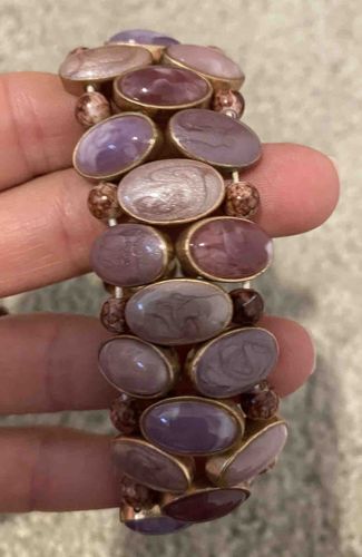 This is a wide, contemporary costume jewelry stretch bracelet featuring a series of oval-shaped cabochons. The bracelet is constructed with three parallel vertical columns of oval links, interconnected by small, round, mottled brown spacers that resemble jasper or patterned ceramics. The oval cabochons exhibit various shades of lavender, mauve, and dusty rose, featuring a swirled or marbled effect consistent with resin or glass molded to simulate semi-precious stones like amethyst or rose quartz. Each oval is set within a thin, bezel-style metallic frame with a matte gold-tone or brass finish. The bracelet utilizes an elasticized double-cord construction, allowing it to expand for a universal fit. The overall aesthetic is bohemian or artisanal, likely dating from the 1990s to the early 2010s. Regarding condition, the metallic finishes show some light surface wear and minor oxidation consistent with age. The elastic cords appear to have some slack, suggesting the tension has been slightly compromised over time. No visible cracks or chips are present in the simulated stones, though minor surface scuffs are typical for this type of fashion jewelry.